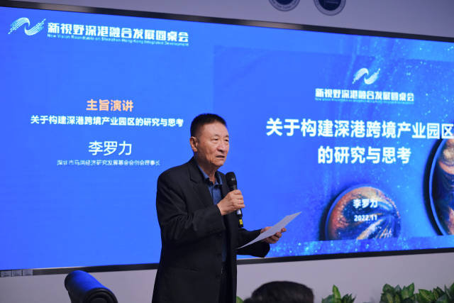 圆桌会召集人、深圳市马洪经济研究发展基金会创会理事长李罗力作题为《关于构建深港跨境产业园区的研究与思考》的主旨演讲。来自深圳、香港、北京、广州等地的二十多位资深专家学者,围绕深港融合发展主题进行了深入讨论。