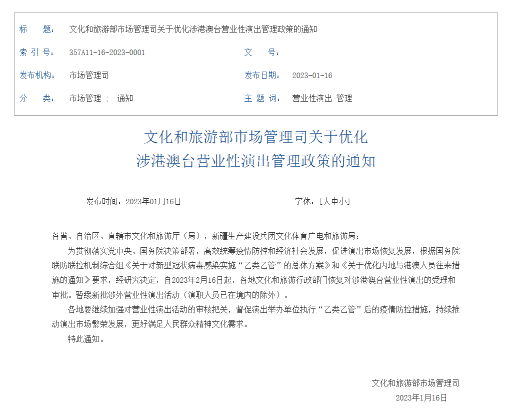 1月16日,文化和旅游部在其官网发布通知,自2023年2月16日起,各地文化和旅游行政部门恢复对涉港澳台营业性演出的受理和审批。全文如下: