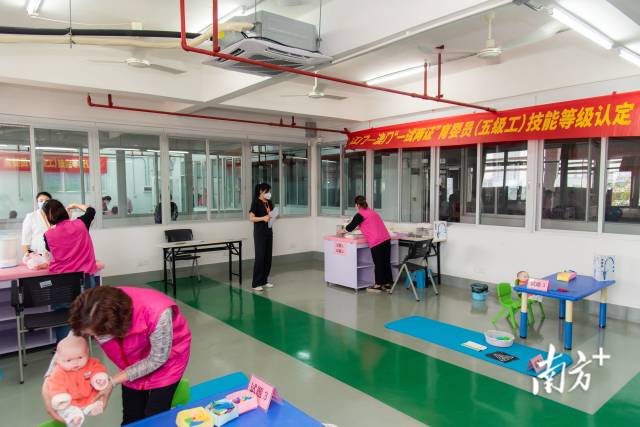 为深入实施“港澳融合”工程,江门市人力资源和社会保障局大力开展澳门、江门技能等级互认,推动开展“一试两证”工作,11月17日,澳门55名学员在江门市(省级)高技能人才公共实训基地参加“一试两证”育婴员(五级工)技能等级认定。经过理论和实操两轮评价,最终考核合格者53名,可获得由评价机构广州谷丰健康产业投资有限公司核发的育婴员(五级)技能等级证书和澳门特区政府劳工事务局、澳门特区政府社会工作局及澳门妇女联合总会三方签署之证书。